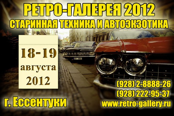 Город-курорт Ессентуки приглашает всех поклонников авто-мото-техники в стиле ретро на традиционные ежегодный Фестиваль старинной техники и автоэкзотики "РЕТРО-ГАЛЕРЕЯ 2012".