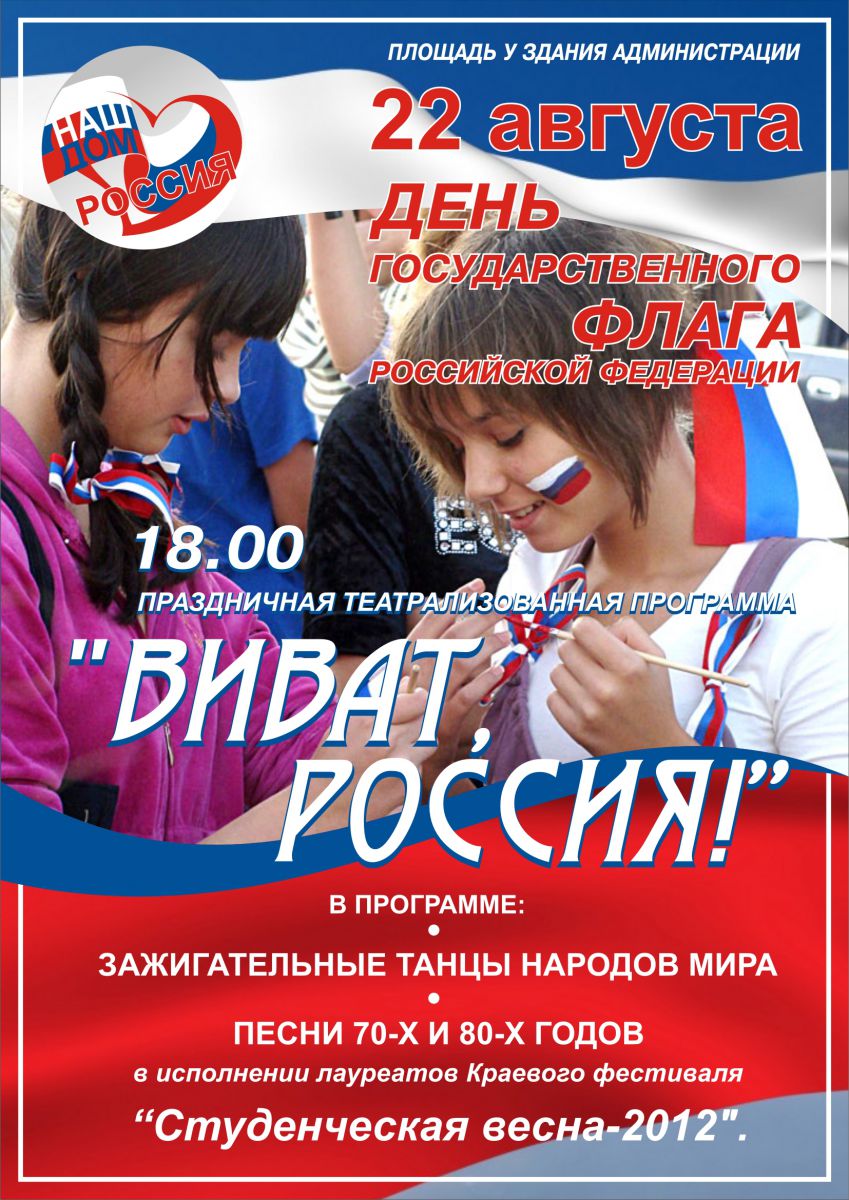 В среду, 22 августа, в городе Пятигорске пройдет концертная программа, посвященная Дню флага Российской Федерации. Начало в 18:00, на площади перед зданием администрации города Пятигорска